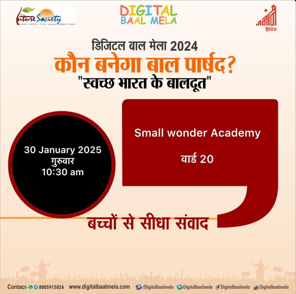 जयपुर नगर निगम हेरिटेज और डिजिटल बाल मेला के संयुक्त प्रयास से 30 जनवरी 2025 को वार्ड संख्या 20 स्थित स्मॉल वंडर एकेडमी में ‘कौन बनेगा बाल पार्षद’ कार्यक्रम आयोजित किया जाएगा। इस कार्यक्रम का उद्देश्य बच्चों में ठोस कचरा प्रबंधन और स्वच्छता के प्रति जागरूकता बढ़ाना और उनके भीतर नेतृत्व क्षमता का विकास करना है।