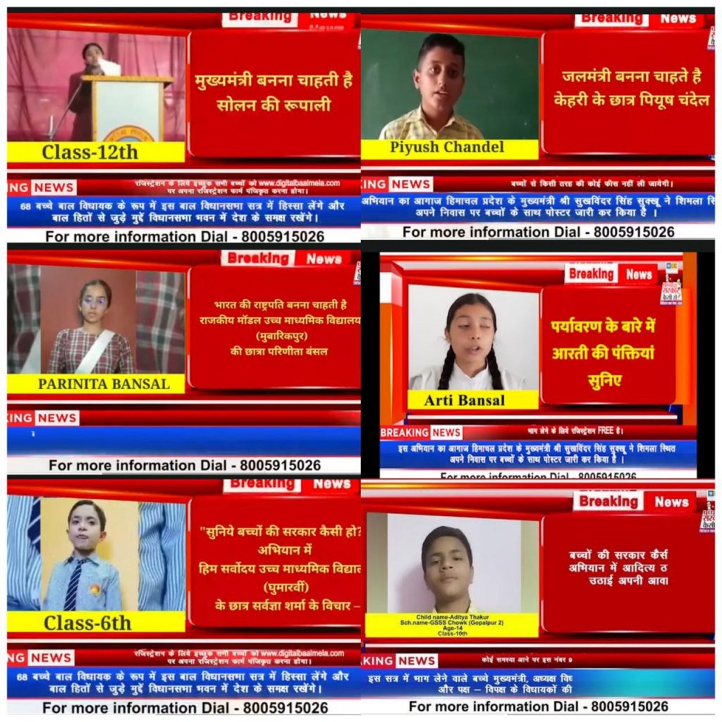 जयपुर: हिमाचल प्रदेश विधानसभा के तत्वाधान में डिजिटल बाल मेला द्वारा “बच्चों की सरकार कैसी हो?” अभियान का आयोजन किया गया| 12 जून को इसी अभियान के तहत शिमला स्थित हिमाचल प्रदेश विधानसभा के सभागार भवन मने बाल सत्र का आयोजन किया गया था| इस सत्र के लिए देशभर से 68 बच्चों का चयन हुआ था| इस बाल सत्र में शामिल होने के लिए बच्चों ने अपनी एंट्री के माध्यम से अपने विचार सरकार के सामने रखे –