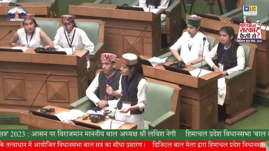शिमला. 12 जून को हिमाचल प्रदेश विधानसभा स्पीकर की अध्यक्षता में राज्य ऐतिहासिक बाल सत्र का साक्षी बना. इस विशेष सत्र के लिए देश भर से 68 बच्चों का चयन किया गया था, जिसकी प्रक्रिया कुल तीन माह चली थी. “बाल प्रतिनिधि” बाल मुद्दों पर अपनी आवाज़ शिमला स्थित विधानसभा भवन मुखर करते नज़र आए. शिमला के बी सी एस न्यू शिमला में पढ़ रही नवेदीता जस्ता का चयन भी इस सत्र के लिए किया गया था जिसमें उनका चयन विपक्ष के विधायक के रूप में किया गया.