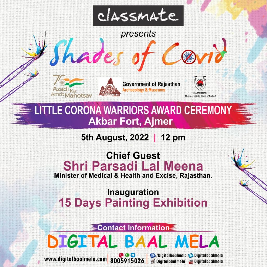 अजमेर के अकबर क़िले में 5 अगस्त दोपहर 12 बजे सजेगा रंगों का संसार …….. आजादी के अमृत महोत्सव के तहत राजस्थान पुरातत्व विभाग के तत्वाधान में क्लासमेट द्वारा प्रायोजित व डिजिटल बाल मेला द्वारा आयोजित की जाने वाली “शेड्स ऑफ़ कोविड़” पेंटिंग प्रदर्शनी अजमेर के अकबर किले में आयोजित होगी। 5 अगस्त को आयोजित […]